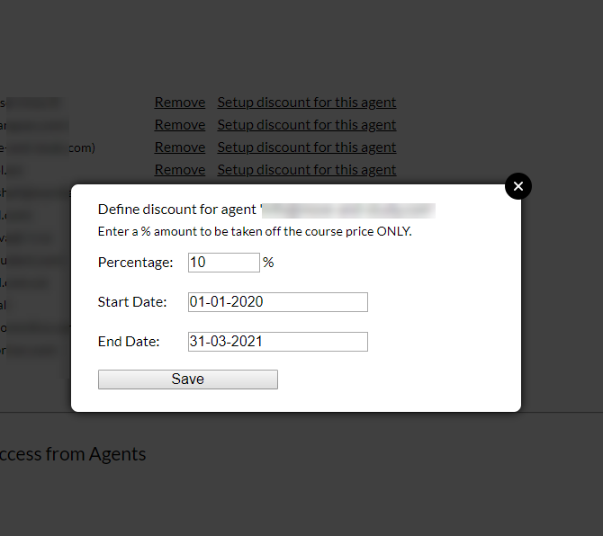 Here the discount, applied to all course elements, is defined for the agent. It can be for any agreed percentage, and will be applied between two dates for a period of up to two years from today's date.